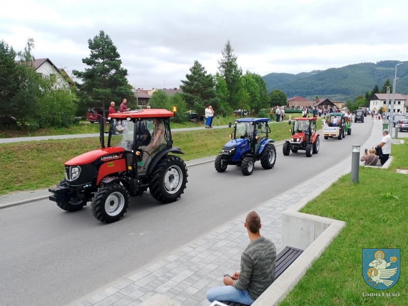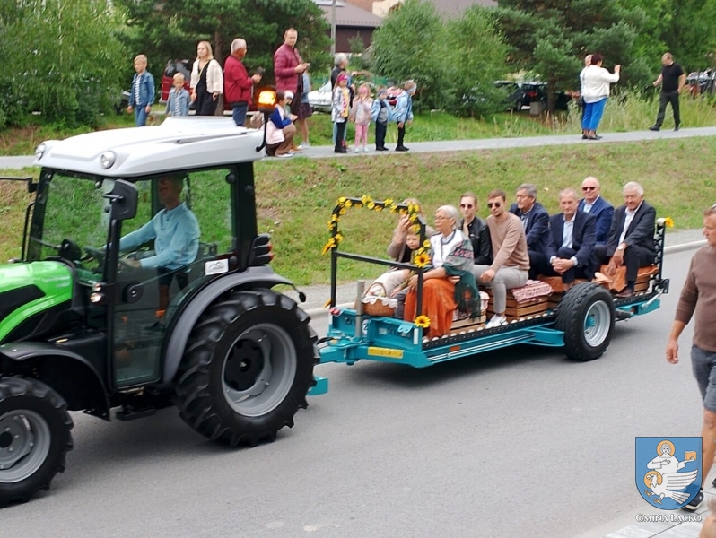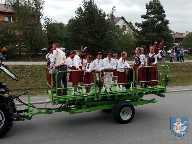 Następnie, w barwnej paradzie traktorów (przyozdobionych plonami), wszyscy udali się na Amfiteatr na Górze Jeżowa. Tam gości powitali Bernadetta Wąchała-Gawełek oraz Wójt Gminy Łącko, Jan Dziedzina.